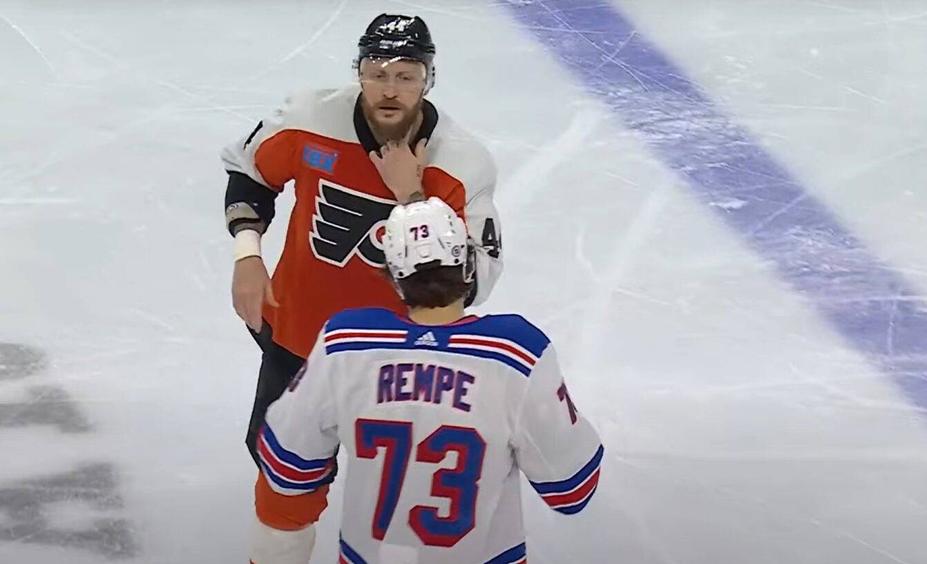 Ein „topaktueller“ Fight schaffte es diese Woche in unsere Kategorie Hockeyfight der Woche. Der erst 21-jährige New York Rangers Stürmer Matt Rempe duellierte sich mit Philadelphia Rüpel Nicolas Deslauriers. Schon beim Warm-Up war klar, dass sich die beiden in diesem Spiel die Fäuste zeigen werden. Denn wie Videos zeigten sprachen sich die beiden an der Mittellinie ab und so dauerte es auch nur bis zur dritten Minute, bis die Handschuhe flogen.