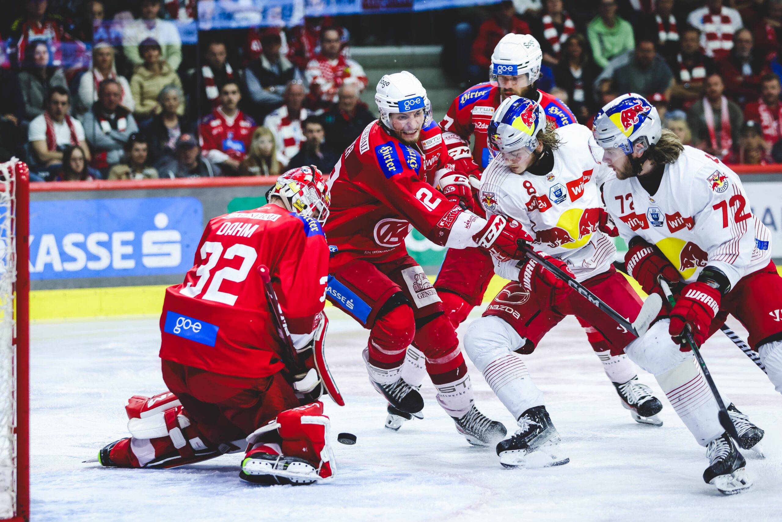 In der absoluten Schlussphase, exakt 4,8 Sekunden vor dem Ende, schrieben die Roten Bullen neuerlich an: Einen von der Bande zurückspringenden Nissner-Fernschuss bugsierte Murphy quer durch den Torraum, der Puck hüpfte von Raffl am langen Pfosten ins Tor. Danach endete auch die dritte Verlängerung der Finalserie mit einem Treffer des Titelverteidigers: Im Powerplay hatte Meyer im linken Anspielkreis Zeit und Platz, um die Scheibe flach durch Dahms Beine zu schlenzen. Salzburg führt im „Best-of-Seven“-Duell nun mit 3:2, die Rotjacken müssen am Dienstag auswärts siegen, um eine Entscheidungspartie auf eigenem Eis zu erzwingen.