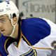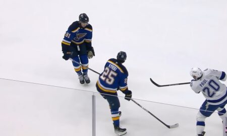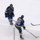 Ein abgefälschter Puck trifft Dylan Holloway am Hals. Der Angreifer der St. Louis Blues spielt noch einige Sekunden weiter, braucht dann aber...